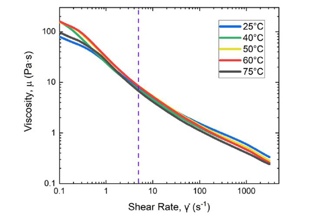 隨著溫度的升高,漿料內部液體分子的無規則熱運動、聚合物鏈的運動和懸浮顆粒的布朗運動都會增加。研究溫度對NMC532正極漿料流變特性的影響。不同溫度下,漿料應力與剪切速率的曲線如圖4所示。結果表明,在剪切速率約為1.0 s-1的范圍內,所有溫度下流體都表現出剪切應力平臺,從而驗證了在所有溫度范圍內漿液都存在屈服應力(見圖4)。從25℃到60 ℃范圍內,屈服應力隨溫度的升高而增加,但在75℃時屈服應力下降到25℃的水平。