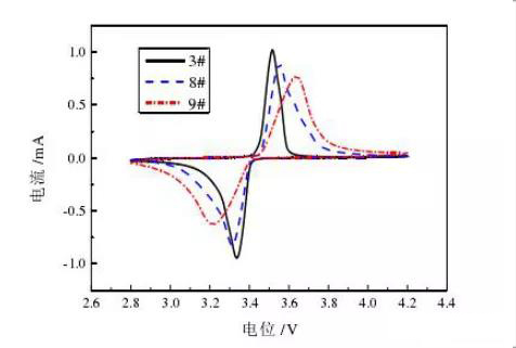 圖 10為各樣品的循環伏安性能曲線,3#、8#、9#分別為160°C、90°C 、20°C條件下輥壓極片制作的電池。由圖可見實驗樣品中當軋制溫度為 160°C 時,向上的氧化峰與向下的還原峰對稱性較好,峰位差也最小,充電和放電的可逆性也最好,證明庫侖效率必然也高。(劉斌斌. 動力鋰離子電池極片精密制造理論與實驗研究[D]. 太原科技大學, 2017.)